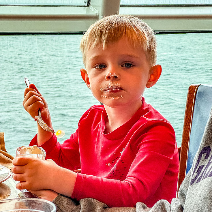 Any morning without an early excursion means breakfast at the Windjammer. With two small kids, a buffet is the easiest choice. Benson piled up fruit and donuts, while Molina added Froot Loops to her plate along with fruit. Her egg allergy limits what she can eat, but she still enjoyed plenty.