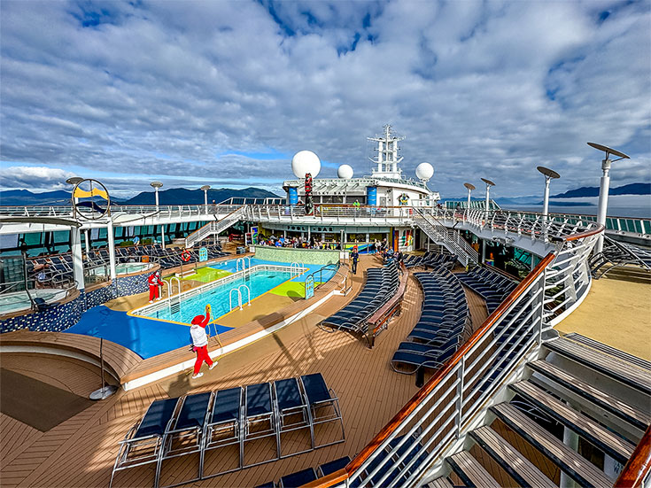 Deck 12 had Samba Grill, the video arcade, sports court, kids pool, Adventure Ocean, the nursery, Optix Teen Disco, Sky Bar, and fitness center. Deck 13 featured miniature golf, the rock climbing wall, Concierge Club, and Viking Crown Lounge. Exploring each space was a highlight of our Alaska Inside Passage sea day.