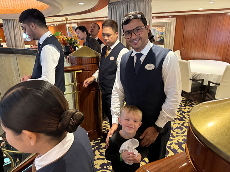 That evening, the ship celebrates the crew and staff. We learn where they come from and what roles they fill onboard. Seeing familiar faces feels meaningful after a week together. The celebration moves into the dining room, where staff dance and guests cheer. Benson joins in, feeding off the energy.